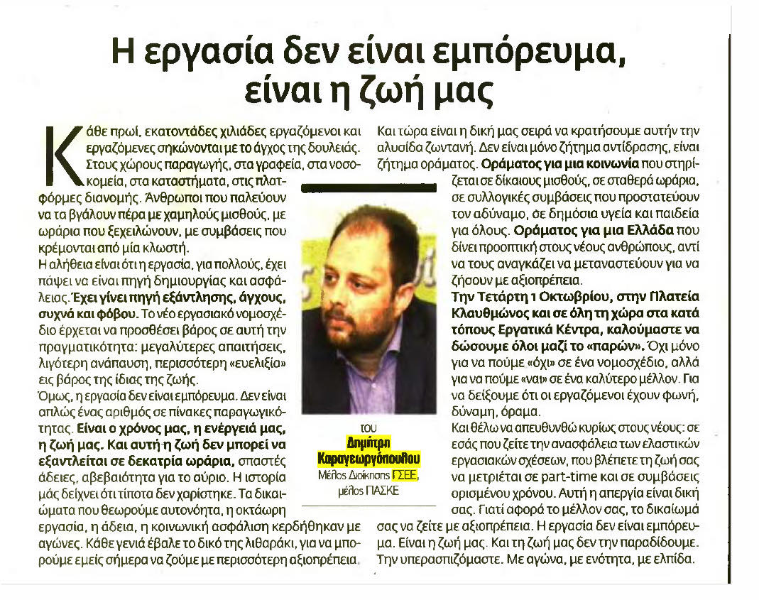 Δ. ΚΑΡΑΓΕΩΡΓΟΠΟΥΛΟΣ: Η εργασία δεν είναι εμπόρευμα – Είναι η ζωή μας (Εφημερίδα “ΚΑΡΦΙ”)